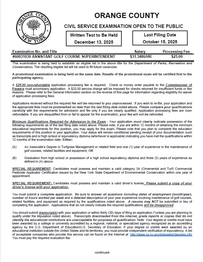 Civil Service Exam – Assistant Golf Course Superintendent October 2, 2025 by Steve Laico in News, Notices
