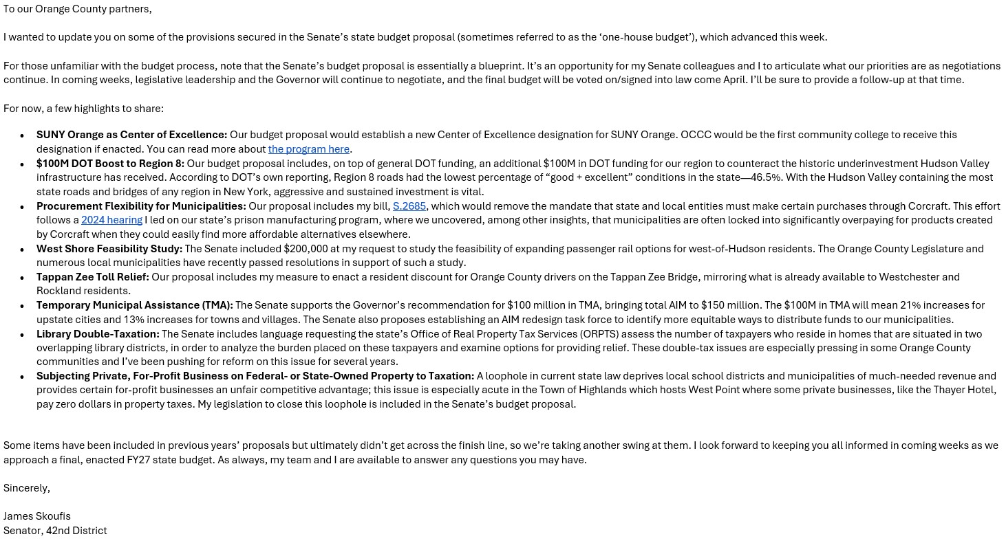 The Orange County Transportation Council’s (OCTC) draft SFY 2026-2027 Unified Planning Work Program (UPWP) is available for public comment from January 22, 2026 until 5:00pm, Thursday, February 5, 2026. The draft may be accessed at: https://www.orangecountygov.com/2665/Unified-Planning-Work-Program-UPWP .
